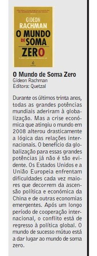 A lógica de soma zero, na qual o lucro de um país equivale à perda de outro, impediu que as nações chegassem a acordo no combate às alterações climáticas e ameaça conduzi-las a um novo declínio económico generalizado. A lógica soma-zero está por detrás de outros problemas internacionais, como o da guerra no Afeganistão ou o do acesso às reservas de energia, água e alimentos. Estas questões políticas e económicas podem provocar novas guerras, catástrofes ambientais e crises financeiras agravadas.